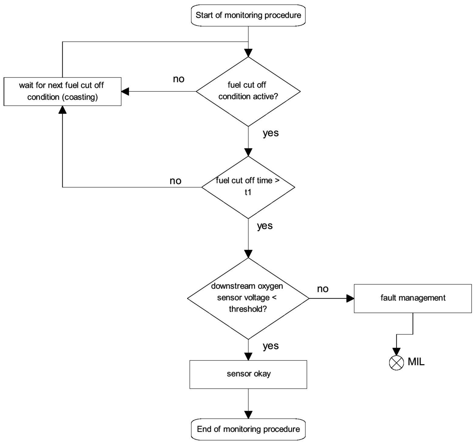 During coasting, the ECM is watching the downstream sensor voltage, which has to go under a specific lean threshold. The diagnostic is enabled if coasting was detected for a specific time and the integrated air mass exceeds a specific threshold.