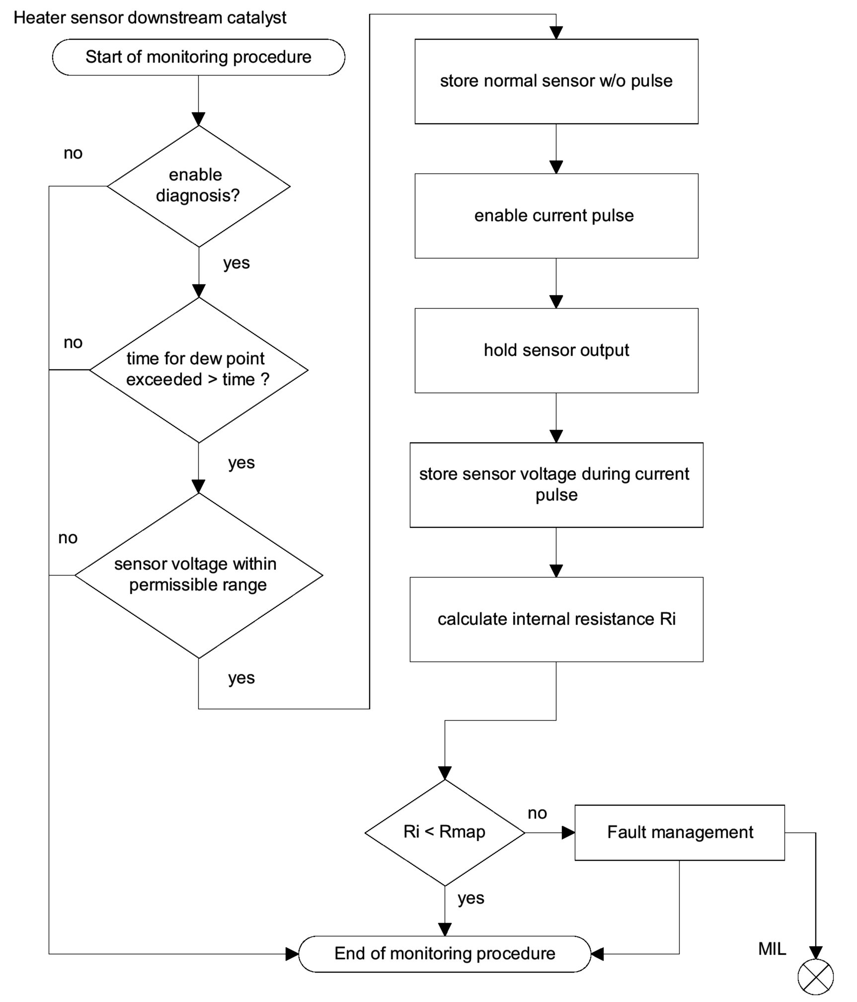 For diagnostic of the sensor heater a specific current pulse is supplied via a load resistance and the voltage is measured. The intern resistance of the sensor heater is calculated with the voltage deviation. The result will be compared with a reference map resistance, which considers aging and sampling deviations. In case of internal resistance > map resistance the diagnosis stores a fault and the MIL will be illuminated.