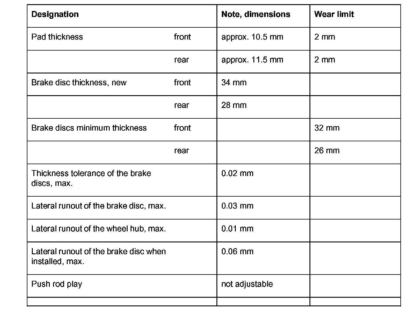 Technical data/Brake wear limits