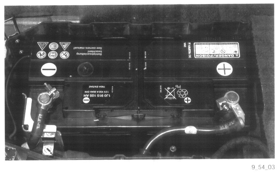 A battery under the driver's seat supplies the voltage. Since there are fewer variations in temperature, this location provides more stable performance than batteries mounted in the engine compartment. In the event of an accident, a safety switch (integrated into the primary battery relay in the distributor) disconnects the battery from the vehicle electrical system. In an emergency, the connection can been established via a push-button switch on the relay.