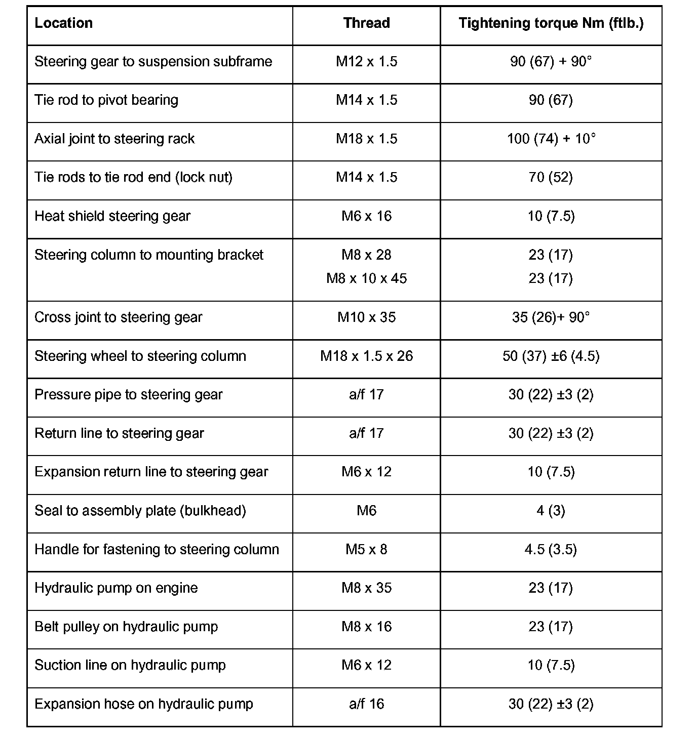 Tightening torques for