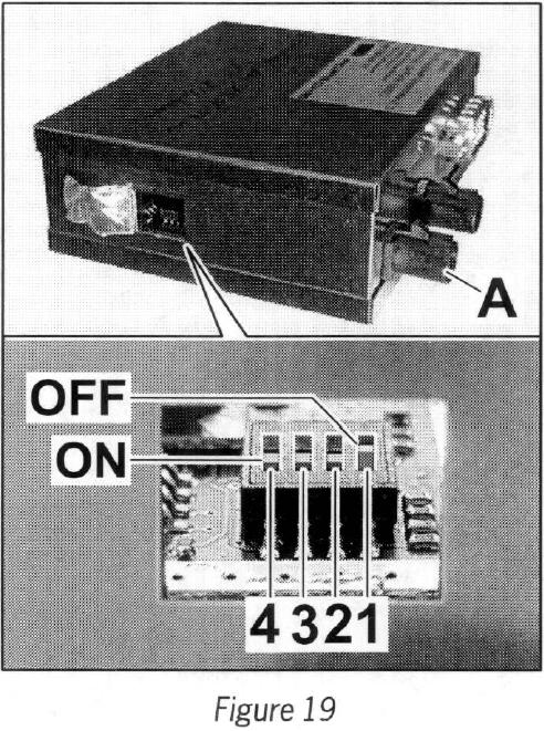 The DIP switches are arranged from the left (DIP switch 4) to right (DIP switch 1), starting from the connection side of the control unit (Figure 19 -A-).
