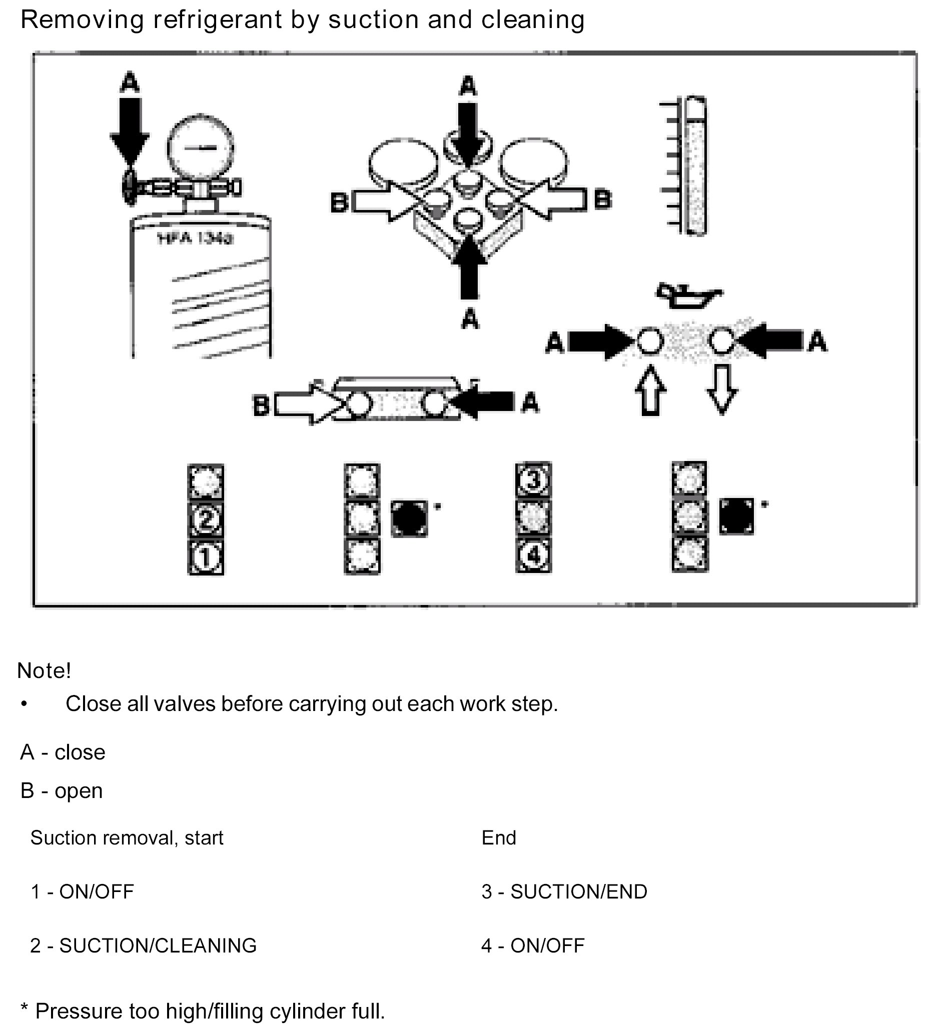 NOTE: In the event of insufficient refrigeration performance, remove the refrigerant by suction, top up with the stipulated quantity and check the system for leaks.