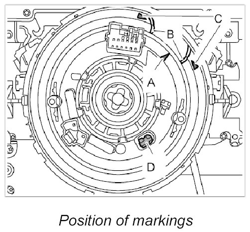 - Ensure that the arrow -A- of the rotor is positioned between the markings -B- of the arrows -C- of the airbag contact unit and that the latch -D- is engaged.