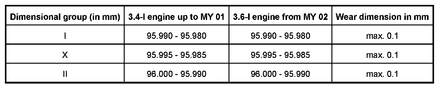 The maximum wear allowed on specified measuring point is 100 microns (= 0.1 mm). If this measurement is exceeded, the piston must be replaced. The reference measurements for the piston dimensional groups are to be taken from the following table!