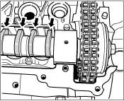 7. Insert exhaust camshaft 1-3. Lay the control chain on the flange for the chain sprocket, then insert the camshaft at overlapping TDC of cylinder 1 (the cams of cylinder 1 point diagonally downwards towards the outside of the cylinder head -arrows- ).