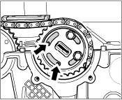 8. Install the chain sprocket of the exhaust camshaft. Insert the chain sprocket in the control chain, then position on the camshaft flange. The four threaded bores in the camshaft flange must be fully visible on the left at the slot curves of the chain sprocket, so that the four M6 x 12 hexagon-head bolts can still be positioned to fasten the chain sprocket.