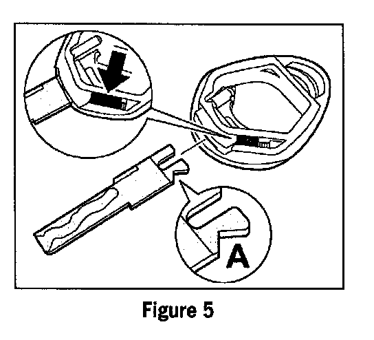 2.2 Push key blade in lower part of key housing until the sliding latch, Figure 5, arrow is felt to engage.