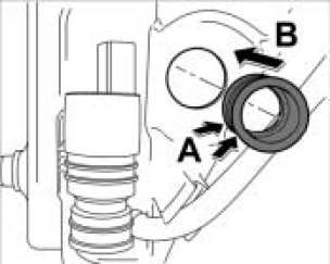 1. Apply a suitable rubber lubricant (tyre mounting paste) to the sealing surface -arrows A- and press the rubber seal into the tank -arrow B- until it is felt to engage.