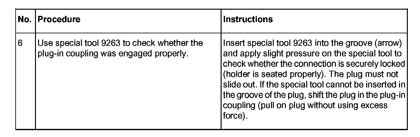 Correct engagement must be checked with a gentle pull. Use special tool 9623 for this purpose