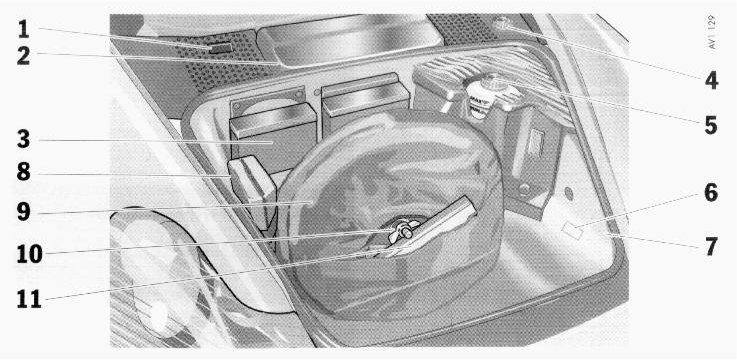 9 - Tool kit and jack are located behind the spare wheel (spare wheel must be removed)