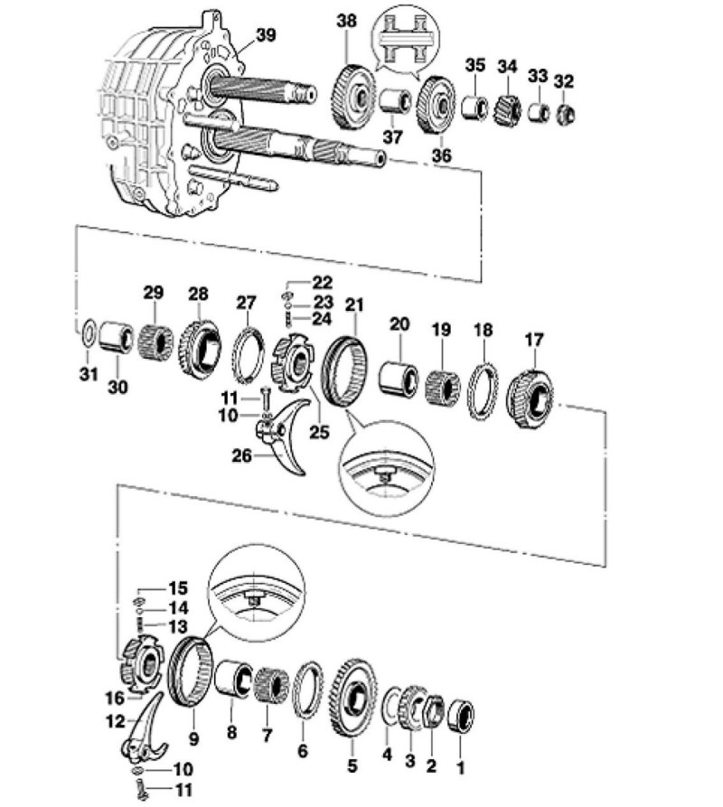 Note: A specific disassembly of the synchronization in assembled state may be recommendable as loss of the small parts can then be avoided.