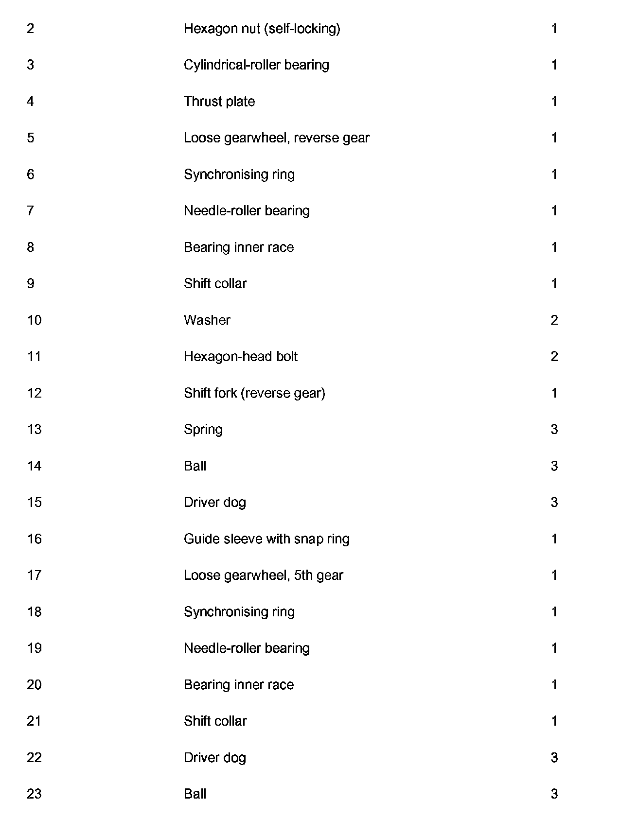 11. Remove loose gearwheel, 5th gear (no. 17 in overview) with needle-roller bearing (no. 19 in overview).