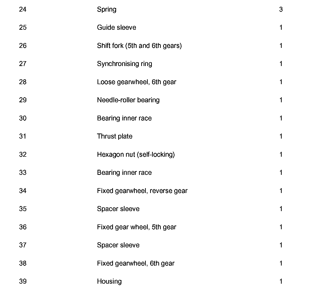 14. Remove loose gearwheel, 6th gear (no. 28 in overview) with needle-roller bearing (no. 29 in overview).