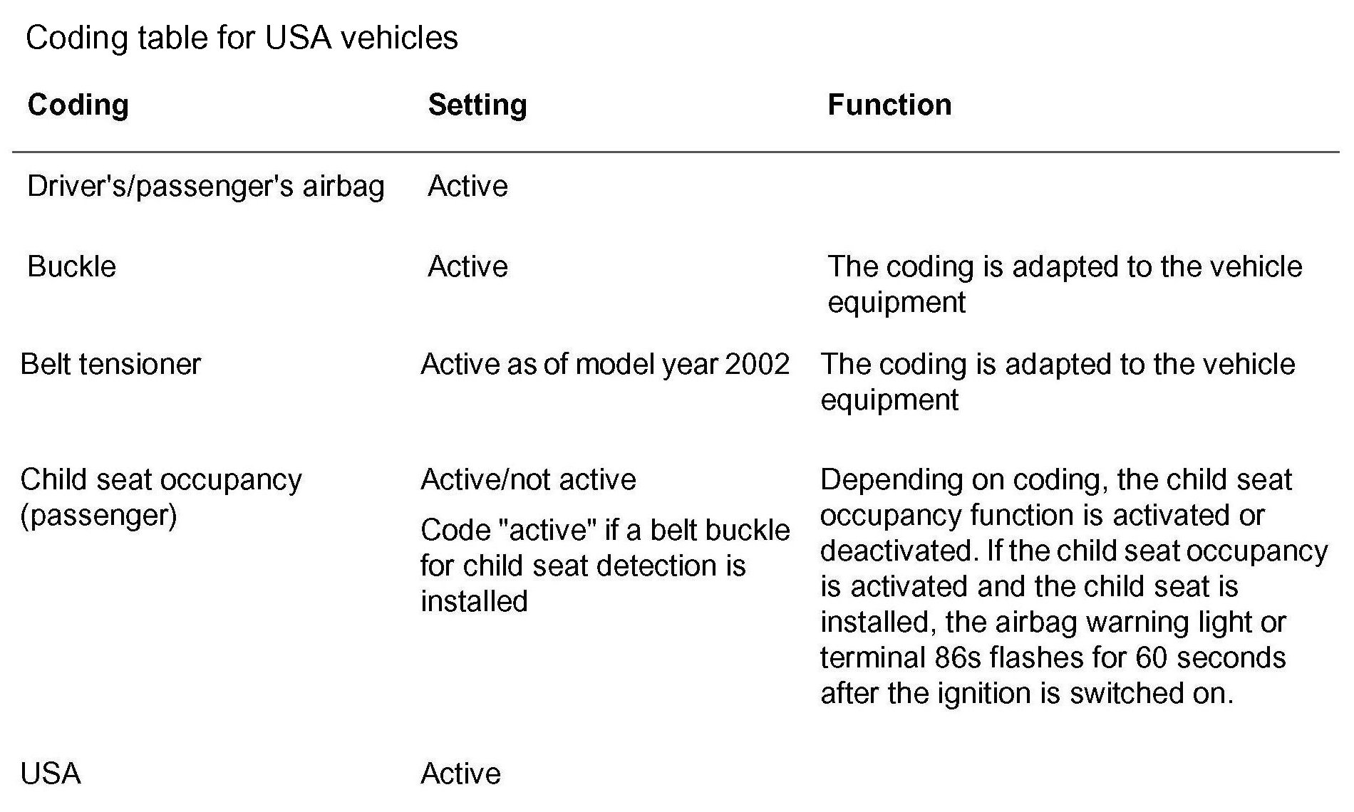Coding table for USA vehicles