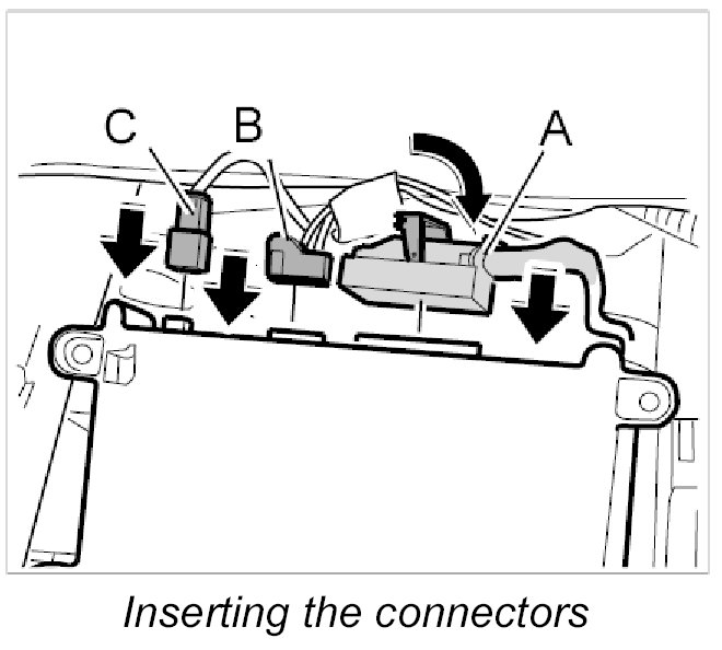 2. Push in electrical plug connections -C, B - until plugs are felt to engage.