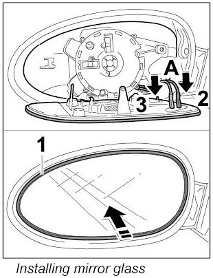 3. Press in centre of mirror glass -Arrow- until the glass engages securely in the adjustment mechanism.