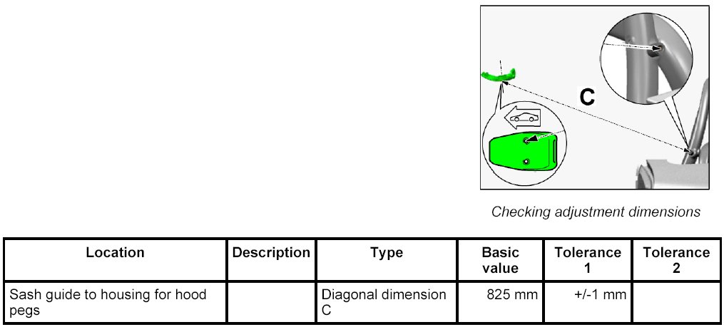 2. Dimension C from centre of edge of housing for hood pegs (inner attachment point) to centre of sash guide.