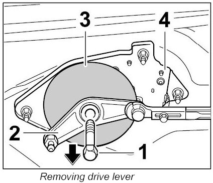 5.1. Unscrew fastening screw -1- and remove drive lever -2- and cover -3- from the hood mechanism -4- ( -arrow- ).