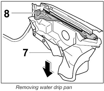 6. Disconnect water drip pan at the left and right -7- from the guide rail -8- ( -arrow- ).