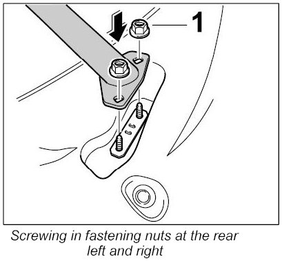 2. Screw in fastening nuts at the rear left and right -1- ( -arrows- ). Tightening torque: 23 Nm (17 ftlb.) ± 2 Nm ( ± 1.5 ftlb.)