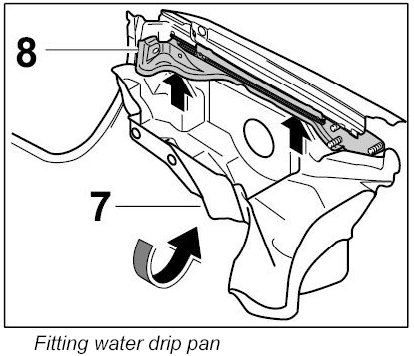 1. Fit water drip pan at the left and right -7- under the guide rail -8- ( -arrows- ).