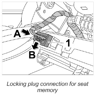 1. Release electrical plug connection -1- by activating the locking tab -arrow A- and remove from seat memory control unit -arrow B-.