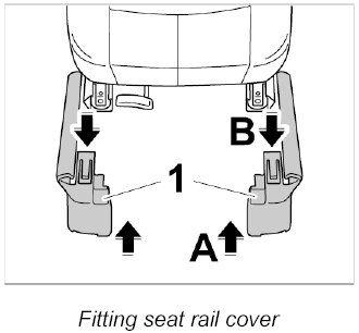 1. Push seat rail cover -1- into front end of the left and right seat rails - Arrow A- until the locking tab audibly engages -Arrow B-.