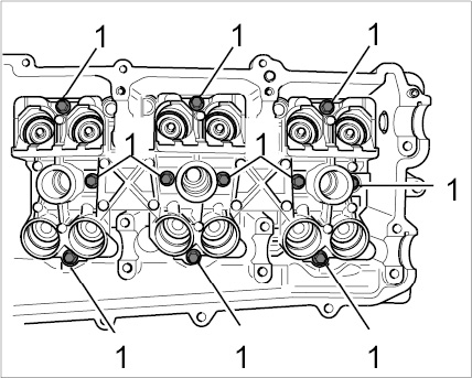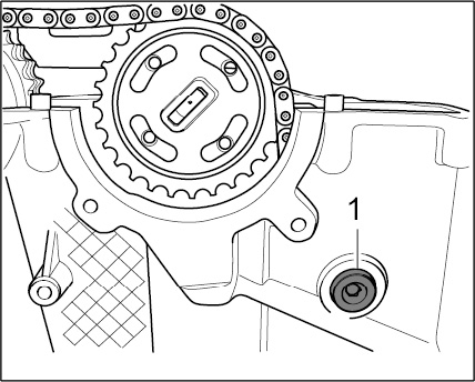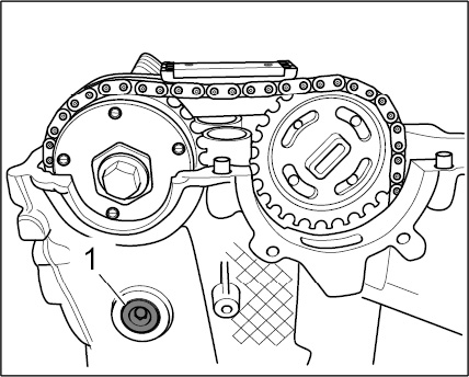 6. Fit threaded bolt for guide rail -1- with a new O-ring at the cylinder head. --> Tightening torque: 10 Nm (7.5 ftlb.)