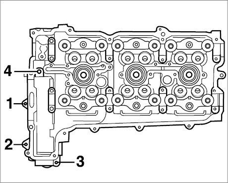 Cylinder head side 4-6 is installed in the same way as the assembly sequence for side 1-3 with the following change: