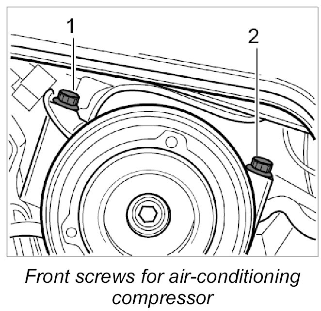 4. Unscrew front Torx screws for air-conditioning compressor (M8 x 90) -1-and -2-.