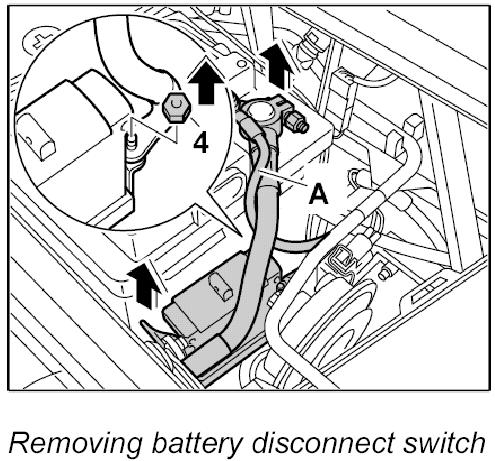 4. Remove battery disconnect switch together with the line for the negative terminal and screw off the fastening nut -4-. Remove line for the negative terminal.
