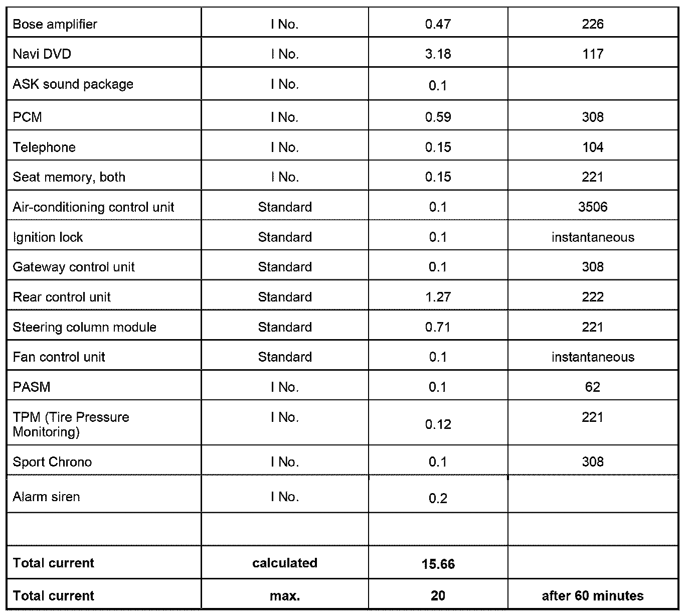 INFORMATION: Before measuring the closed-circuit current, determine the vehicle equipment (I numbers) and establish the expected closed-circuit current with the aid of the attached table.