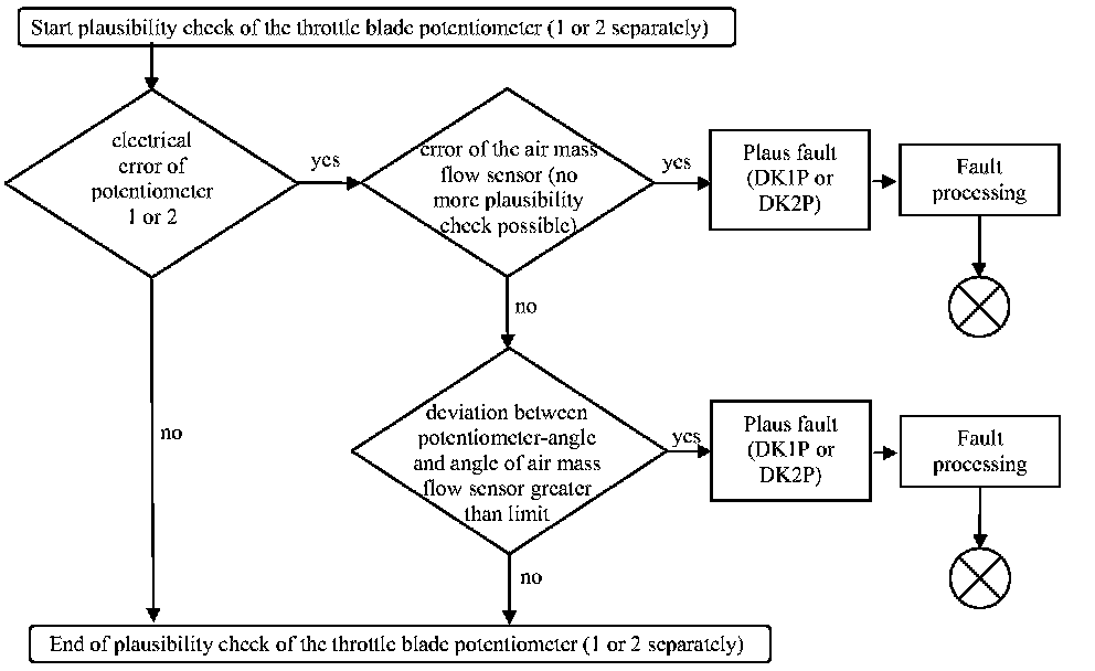 The plausibility check is done with a comparison of the throttle blade angle from the potentiometer and an angle derived from the air mass flow. This check is only done if one electrical error of one potentiometer has occurred.