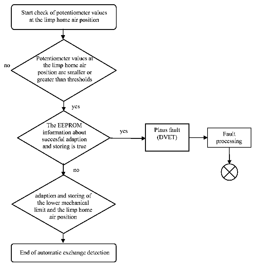 If the throttle body device is exchanged, the actual values of the lower mechanical limit and the limp home air position may differ from the stored values in the ECU. In that case the system detects automatically the need for new adaptation and storing of the potentiometer values at the lower mechanical limit. This check has to be done at the beginning of the driving cycle.