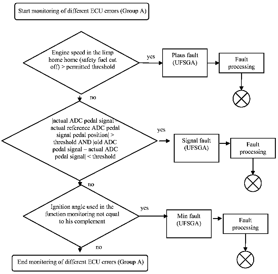 - Monitoring of the engine speed in the case of safety fuel cut off: if the engine speed in the case of safety fuel cut off is higher than a permitted threshold, the ECU reaction will be reset.