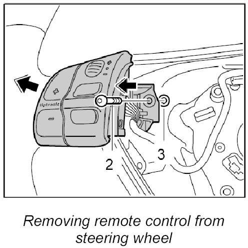 2. Insert remote control into the steering wheel, position washers -3- and screw down with the fastening screw -2-.