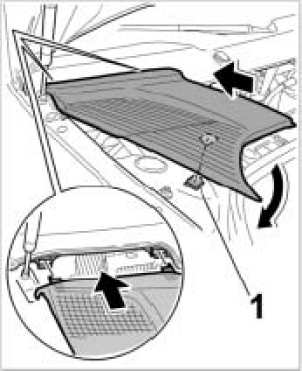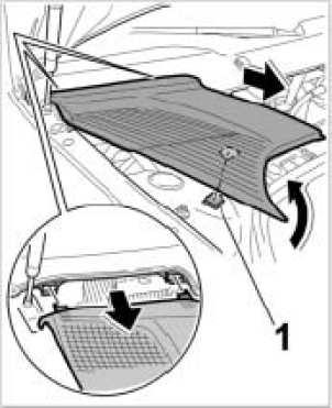 1. Lift rubber lip of luggage compartment seal to one side, lift up the cover and disengage it from cowl panel cover.