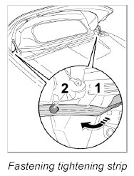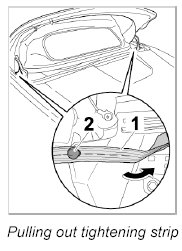 3. Pull tightening strip -1- outwards and engage with the third full slit over the ball pin on the main folding top bow -2- on right and left.