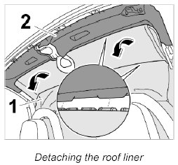 1. Unclip roof liner -1- downwards at front and in centre from bar of roof frame -2-, starting from the outside.