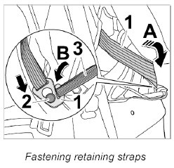 6. Engage retaining straps -3- left and right on hook of roof liner -1- -Arrow B-.