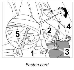 7. Thread cord on pin -5- at bottom -(inset)-, fit cord -2- in the fixing clip -1- and fasten metal pad -3- to convertible top support with water drip pan -4- (right and left).
