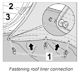 1. Press plastic expansion rivets -1- at the roof liner connection -2- through the fastening holes of the cloth into the tension bow -3- on the left and right.