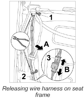 2. Disconnect electric plug connection -3- for backrest seat heating -arrows B-.