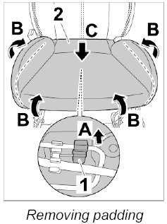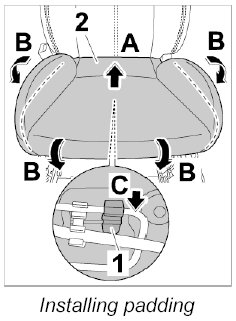 3. Clip in fixing clip -1- underneath the padding -2- ( -arrow C- ).