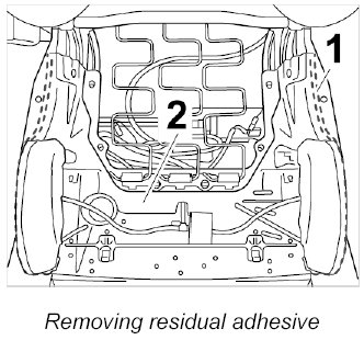 3. Remove residual adhesive -1- and clean sealing surface of seat frame -2- with cleaning agent.