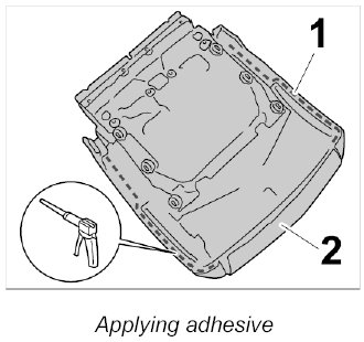 1. Apply adhesive -1- on the marked area of the padding -2-.