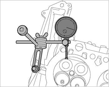 2. Check valve tilt play on intake valve. Adjust the dial gauge to the relevant angle of the valve to be checked and set to '0' with preload. Press valve disc towards dial gauge and pull it back again. Read off value and note it.