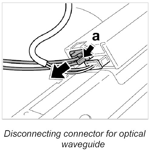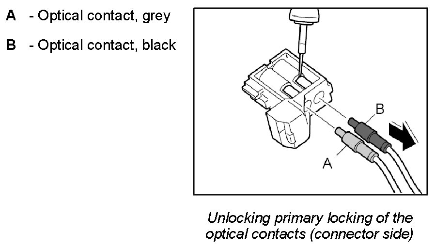 4. Carefully pull on the optical waveguide -A and B- in -direction of arrow-. If it is not possible to pull out the optical waveguide, check again if the locking mechanism is completely released.