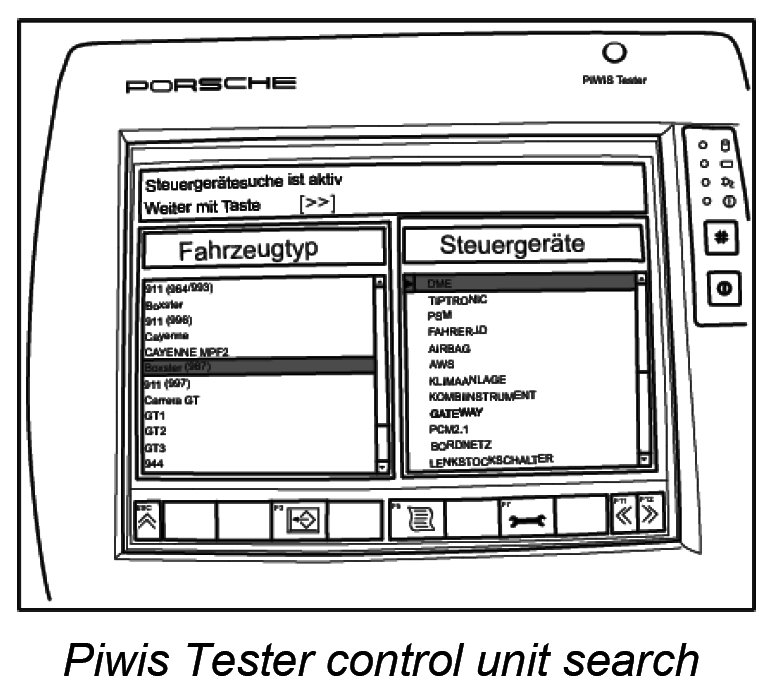 4. Run the individual control unit search for DME using the Porsche PIWIS Tester. To do this, select DME with the tracer pen and press F12 >>.